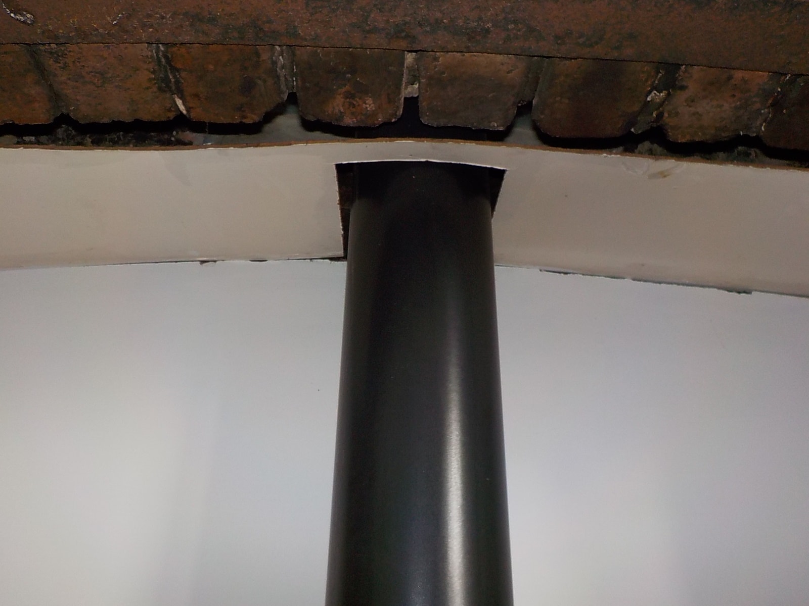 Flue pipe from a stove. The base of the chimney breast should have a closure plate so that air cannot by-pass the appliance causing poor combustion and carbon monoxide. In this case the closure plate neither fits the opening or fits up to the flue pipe.
