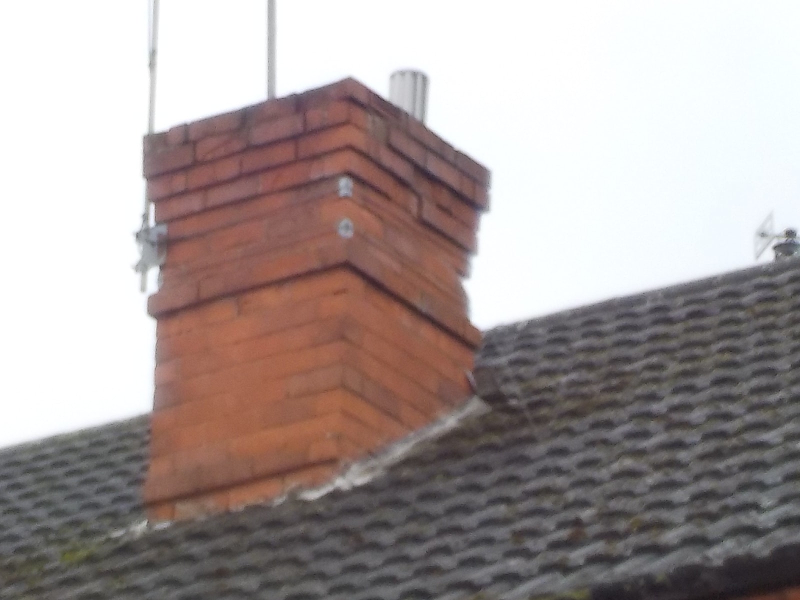 Note the juncture of the chimney and concrete tile roof. The weatherpoofing relies on an aluminium tape stuck to the face of the bricks and tiles. They are vulnerable to failure.