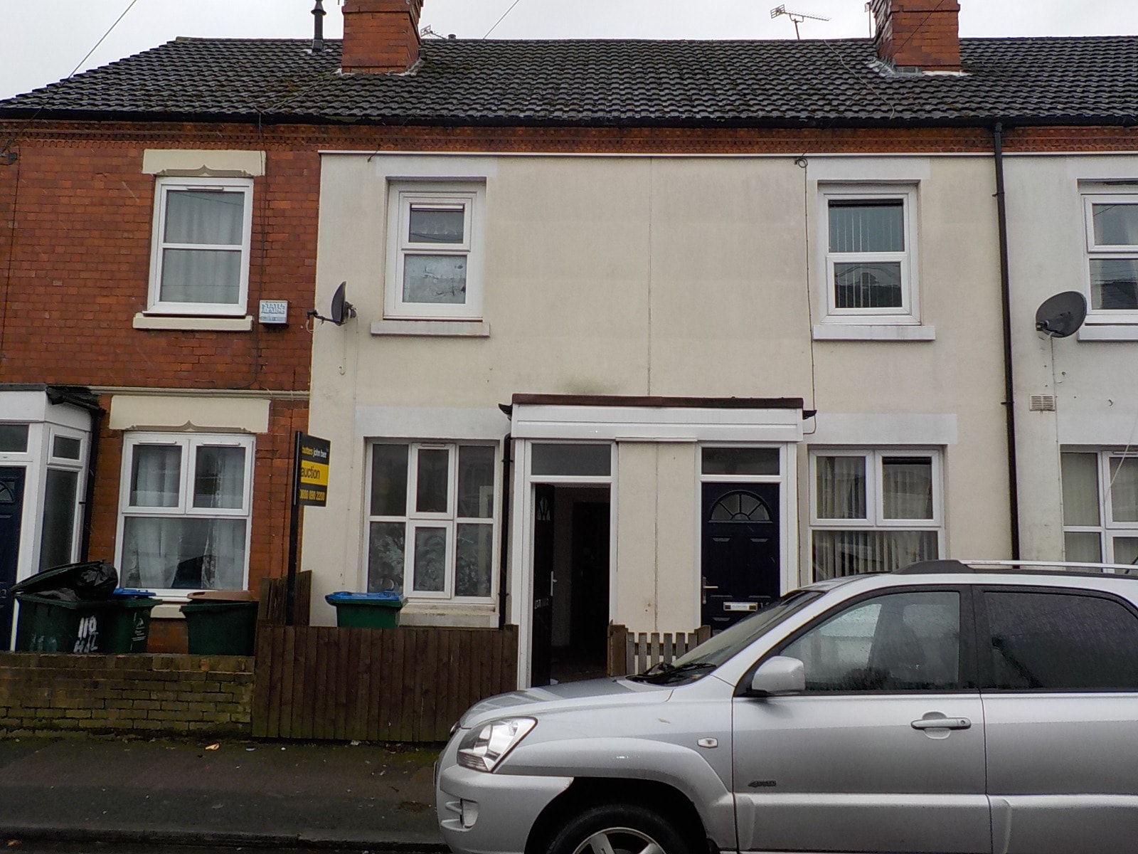 Typical turn of the 20th Century Walsall terrace house that has been retrospectively rendered and had a replacement concrete tile roof. Render is usually applied as a cheap alternative to pointing or because of frost damaged brick faces. Care should be taken that heavy concrete tiles have not overload the structure.