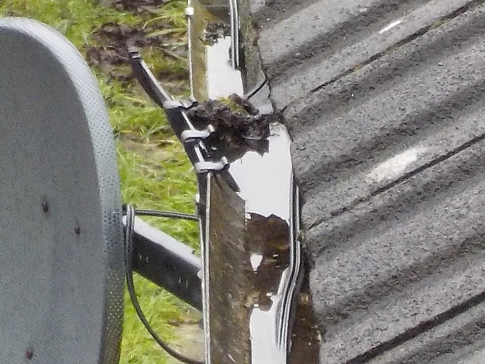 This displaced section of gutter will allow water to spill down the solid wall which will be vulnerable to water penetration.