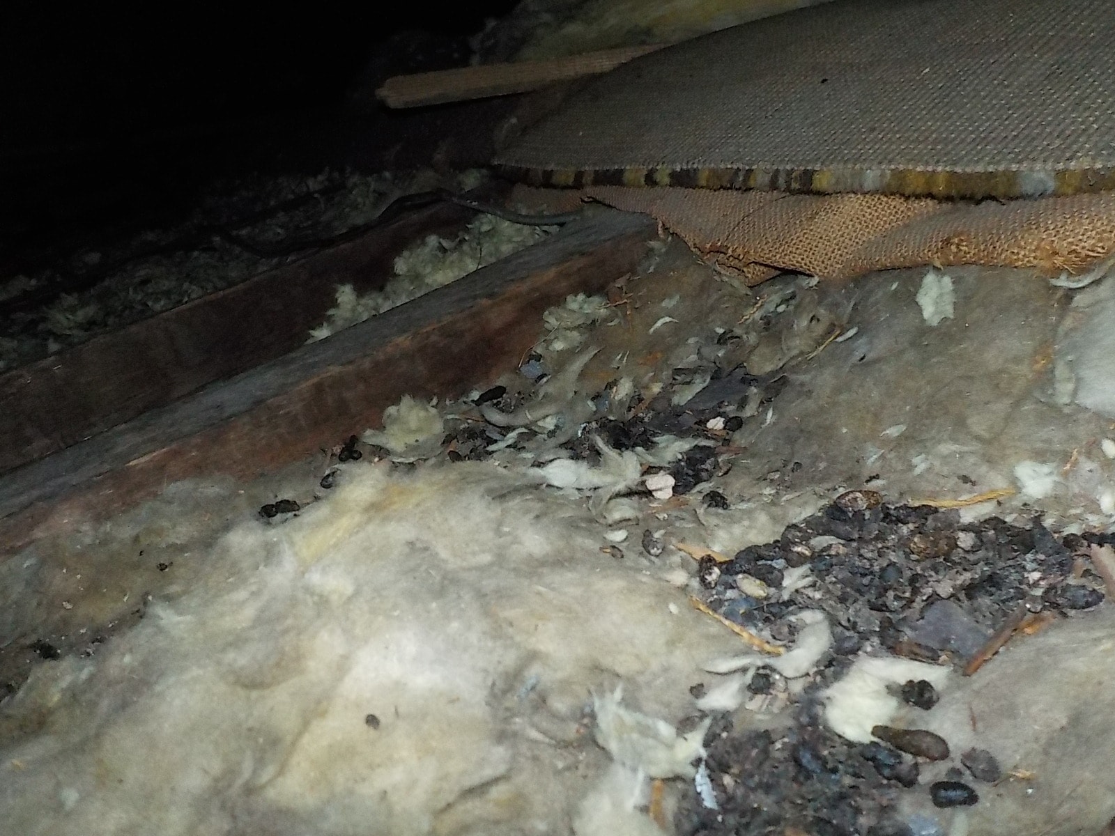 Rat droppings in the roof void. Note the low level of insulation compared to the ceilings joists which are typcially 75mm deep.