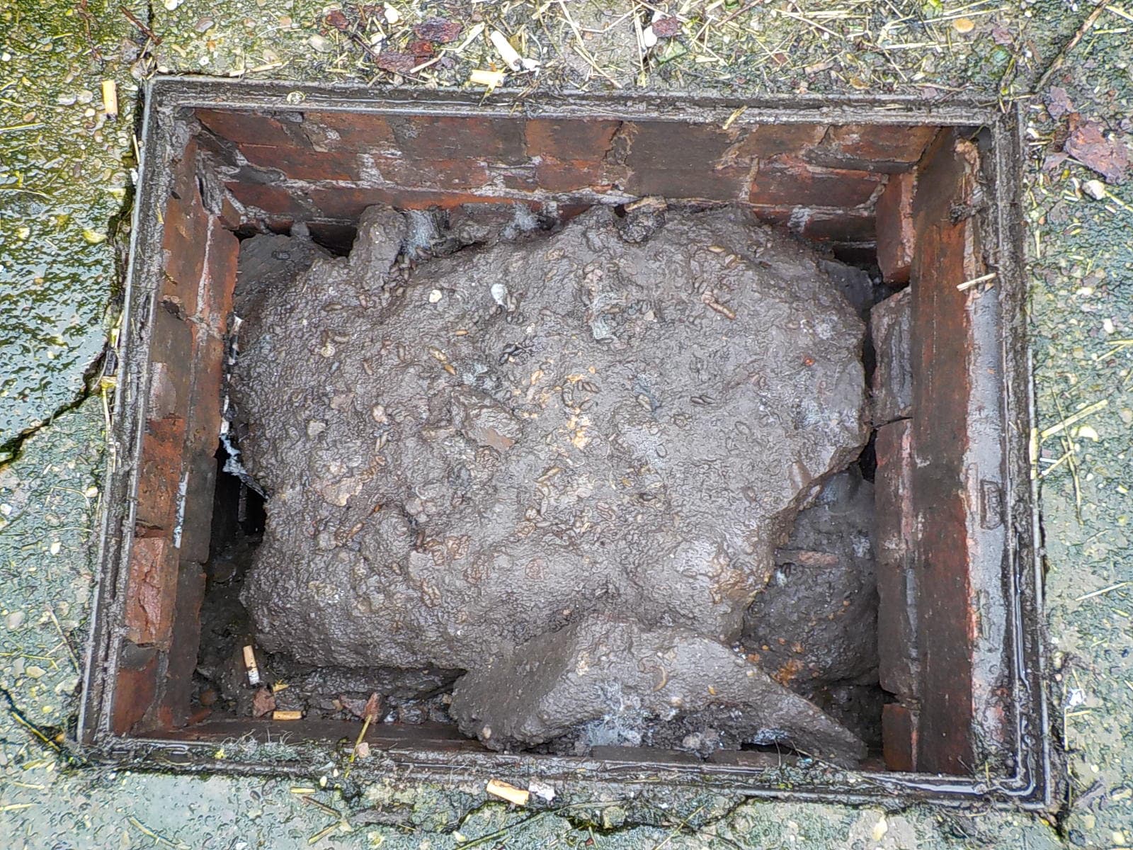 Large chuncks of concrete have been placed in this drain chamber. Inexplicable. Droppings on top of the chamber suggest that rats occupy the drian.