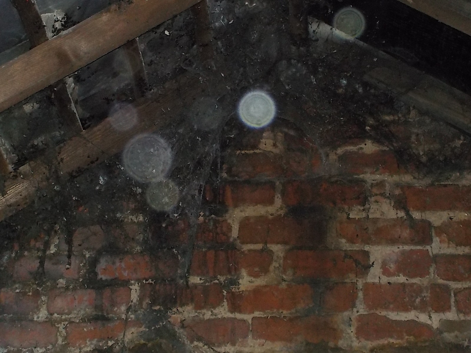 A substantial collection of cobwebs suggests that spiders like it here too. The stains on the chimney might be caused by rain seeping in at the side of the chimney stack but are more likely to be casued by condensates within the flue soaking into the brickwork. They can contain water absorbing salts so that the brickwork remians damp in humid conitions.
